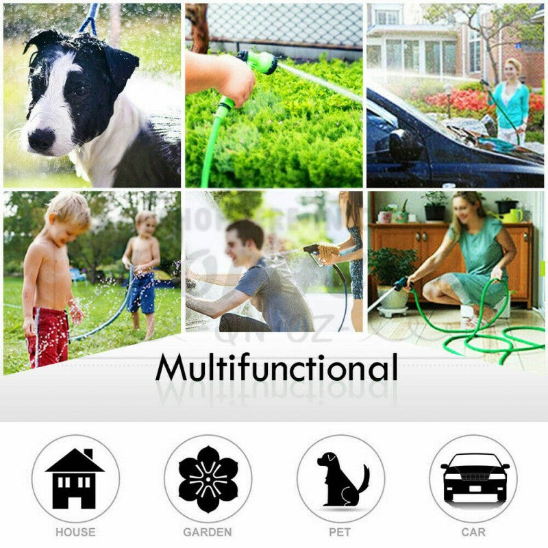 The expandable garden hose nozzle provides 8-function water spray mode, and the rubber handle is easy to grasp and anti-slip. The extended garden hose has many uses, such as car cleaning, gardening, yard cleaning, pet bathing, etc.